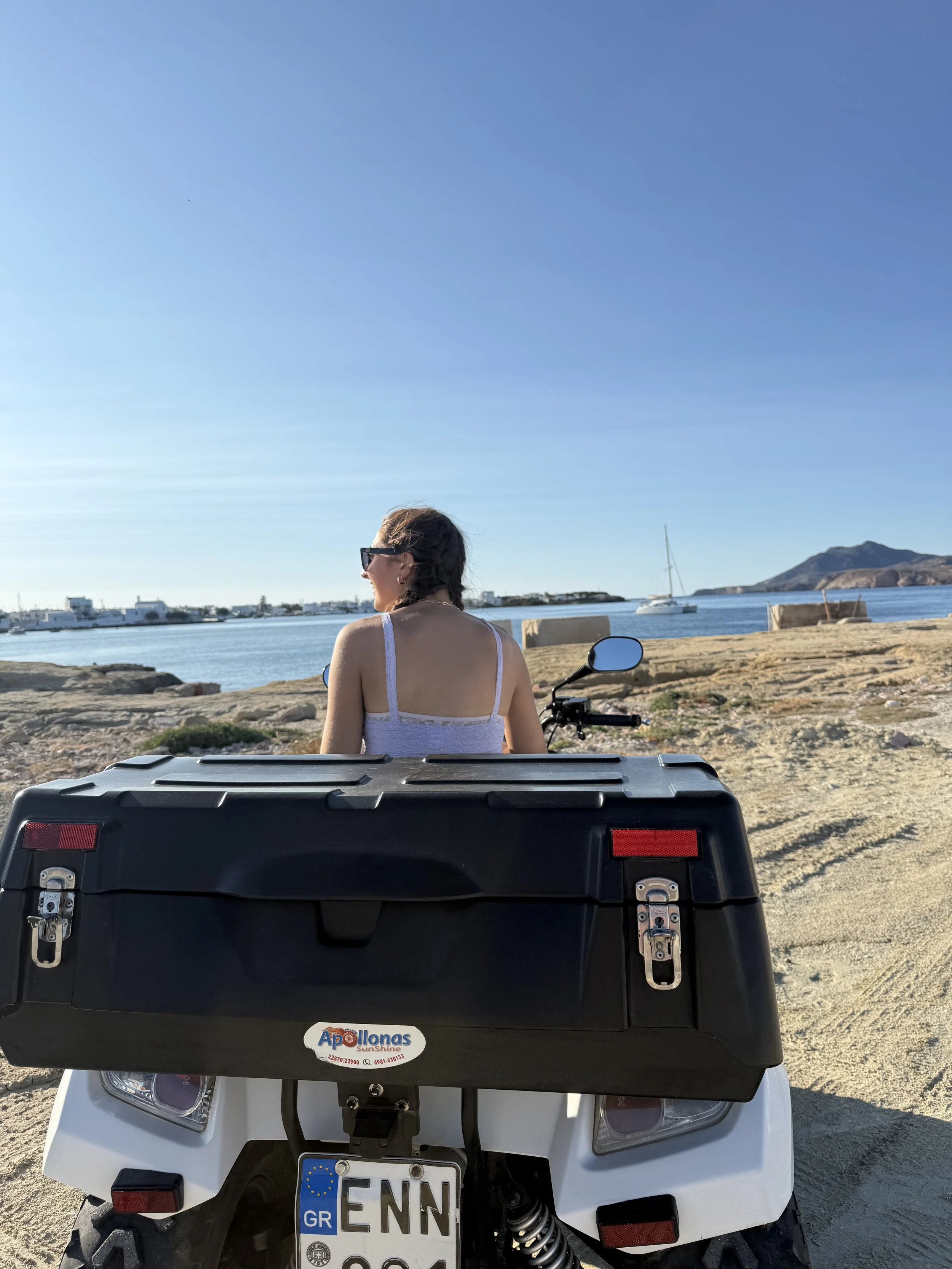 We arrived early in the morning and we grabbed our luggage and dragged them down the streets to an ATV shop called Apollo’s Sunshine Rent a Moto. This was the best decision we made all trip. After what happened in Athens, we did not want to get another car. Turns out ATVs were perfect for this small island. We had to put our luggage in these black boxes that were attached to the back of our vehicles. Some people had to use bungee cords to strap their luggage onto the ATV. Once we learned how to drive them we were off to our beautiful country side house that overlooked the water and was isolated from the town. When we arrived at this house, my breath was physically ripped out from inside me because it was the most beautiful house I had ever seen. The wild flowers brought color to this white house and a stray cat we called Butterscotch said goodnight to us each night. This property was designed by these two sisters mother who had an eye for the arts, but they said she never believed that. You could tell they loved their mother and were proud of the work she put into the house, which made staying there even more special.